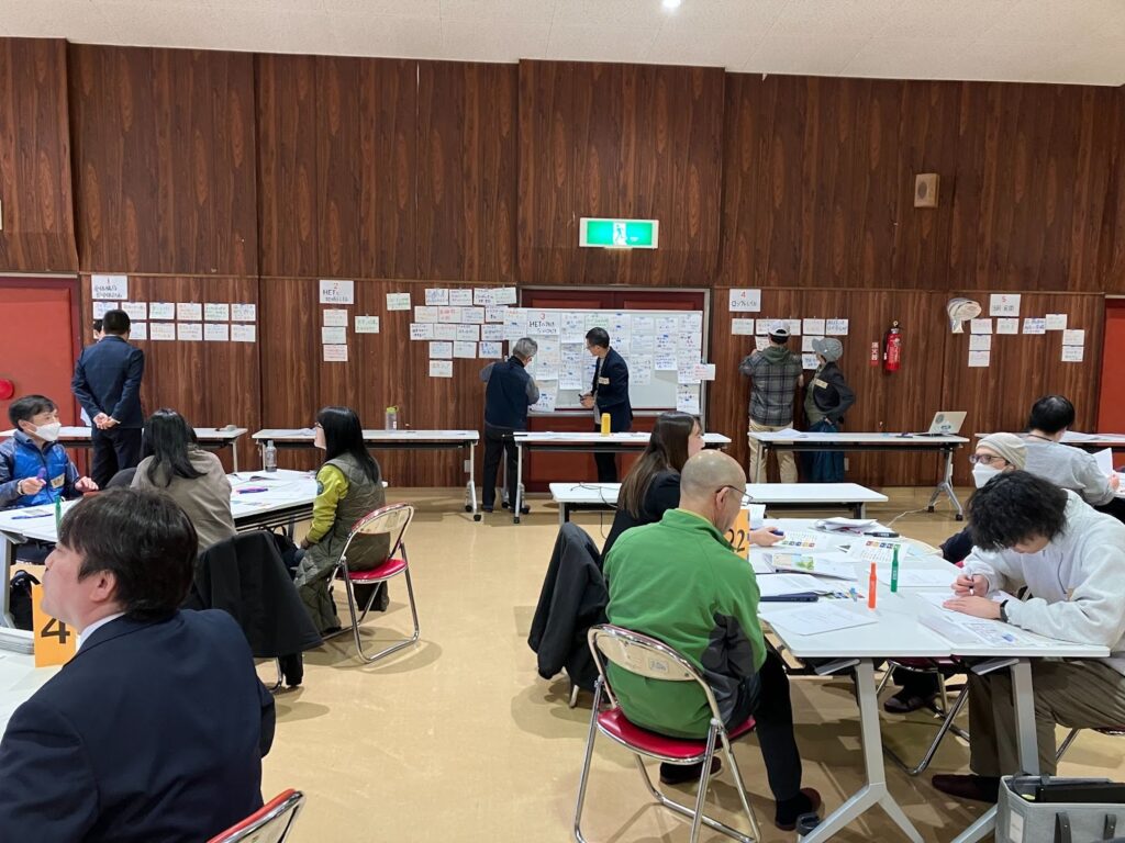 ・参加者は8グループに分かれて着席し、グループごとに意見をA5用紙に書き出した。同時に、5つの項目ごとに設置した屋台を自由に回遊し、担当者と意見交換を行った。意見を記載した用紙は各屋台に掲示し、これらを翌日の検討会における検討資料として活用した。