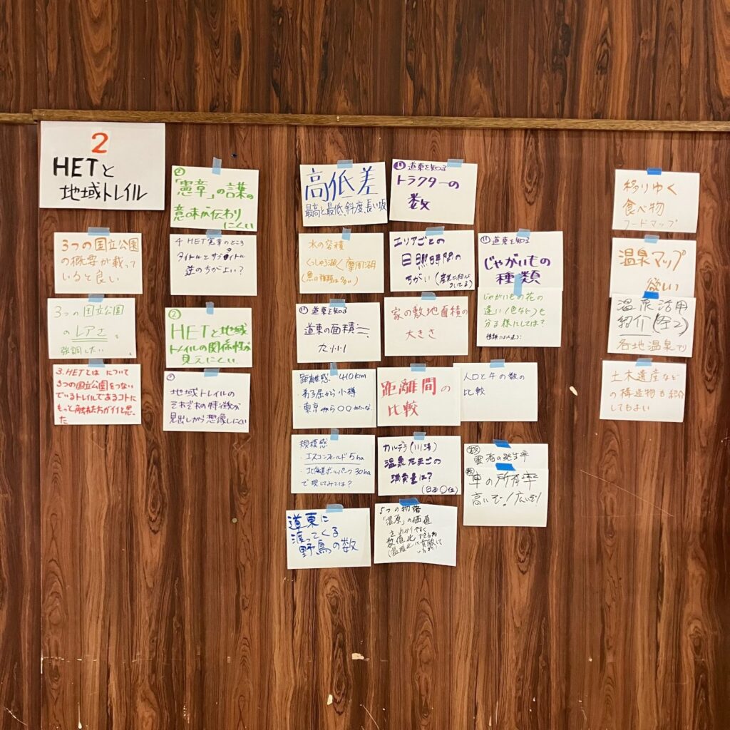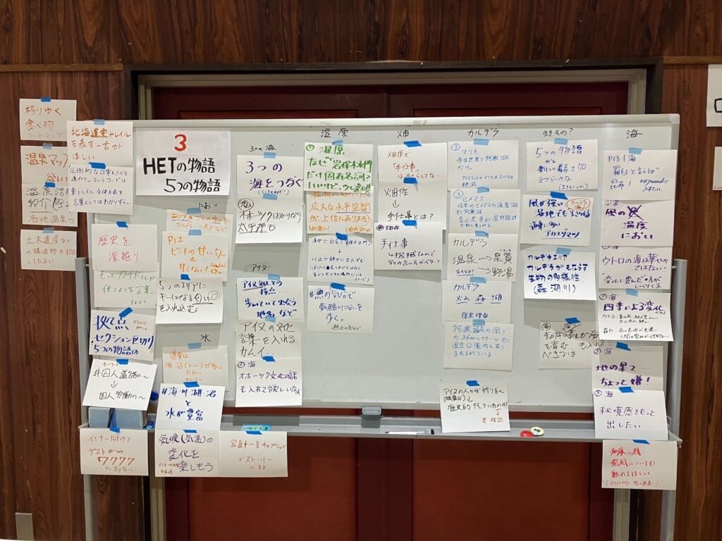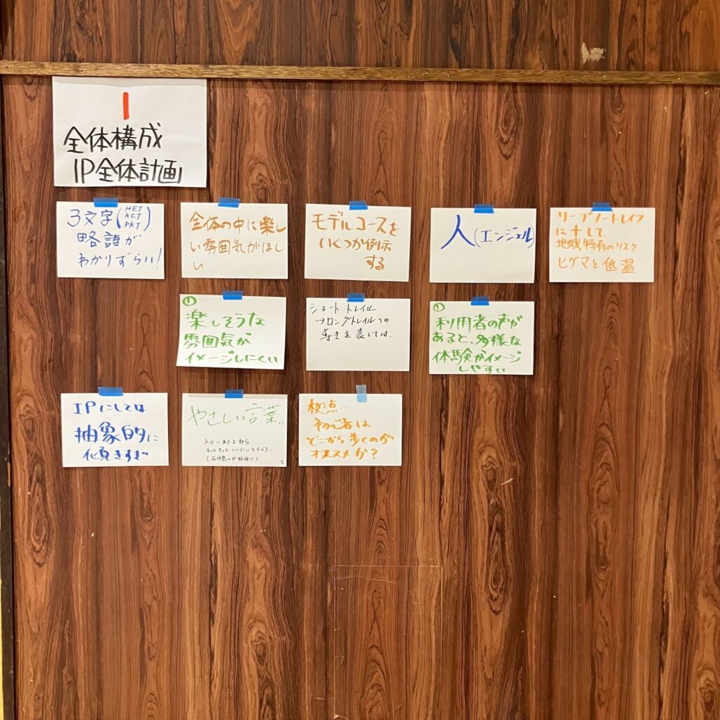 ・「北海道東トレイル インタープリテーション全体計画(案)について」をテーマに、5つの項目(①全体構成/IP全体計画、②HETと地域トレイル、③HETの物語/5つの物語、④ロングトレイル、⑤活用・展開)に対する参加者の意見収集を目的として屋台形式のワークショップを実施した。